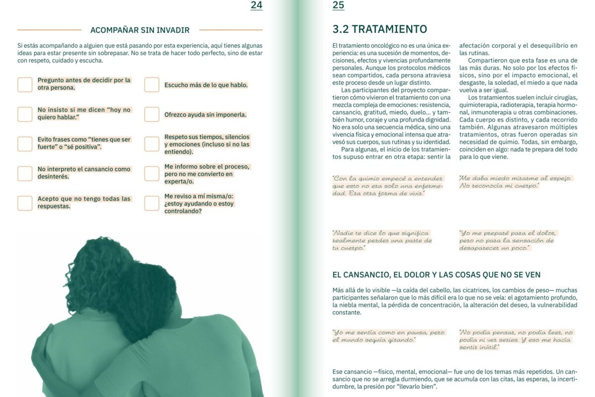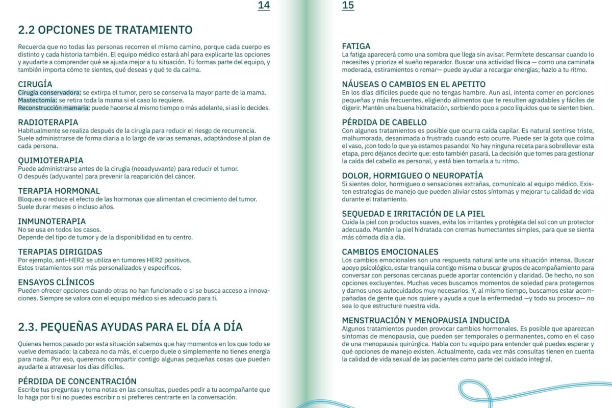 Aquí puedes descargar la Guía Colectiva de Experiencias sobre el Cáncer de Mama en formato PDF. Este documento reúne testimonios, aprendizajes y recursos compartidos por mujeres que han atravesado distintas etapas del proceso, así como por profesionales y acompañantes.