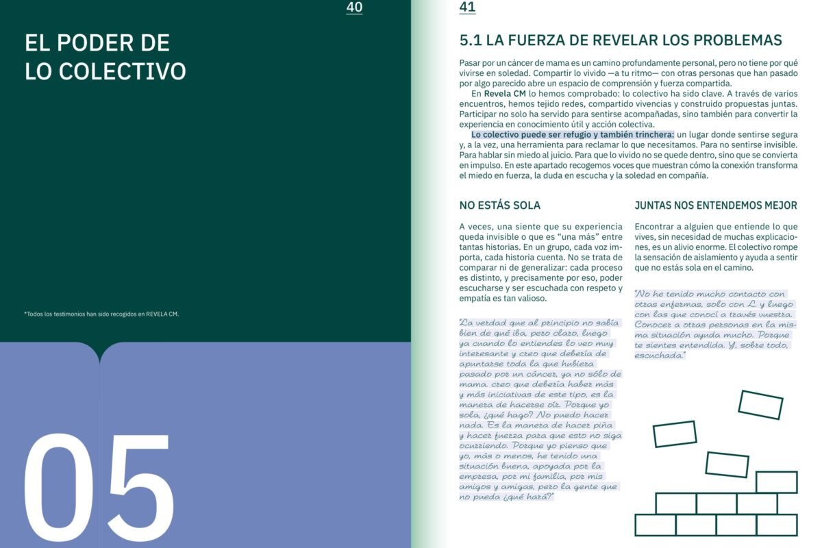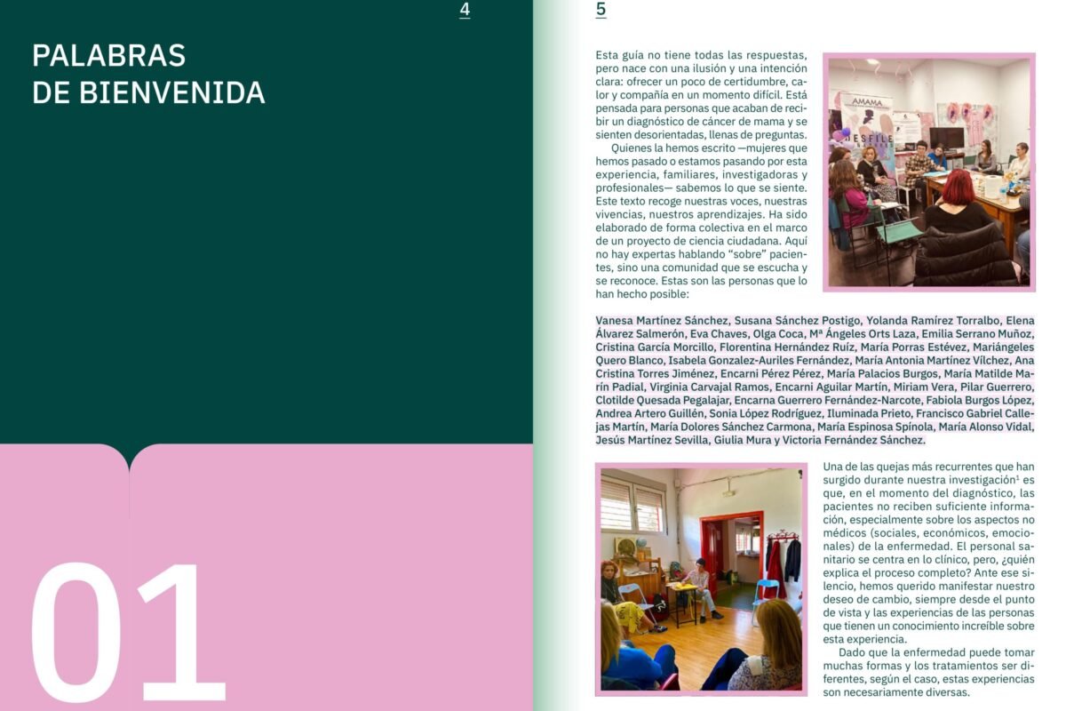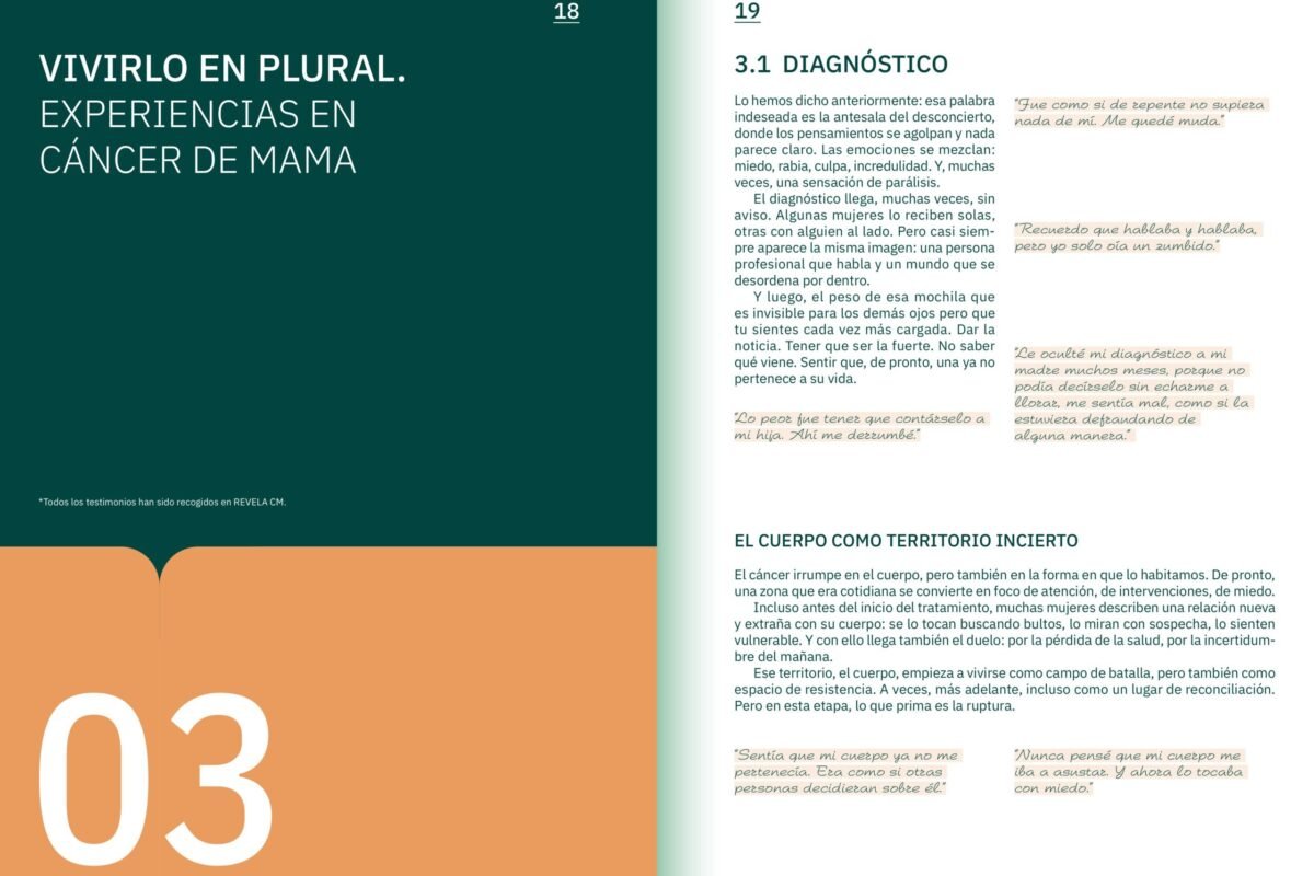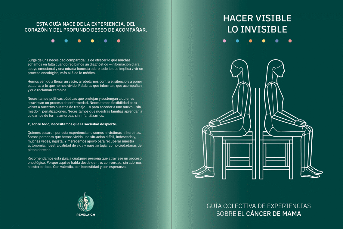En Revela CM ya hemos creado una guía colectiva de experiencias sobre el cáncer de mama, fruto del trabajo conjunto entre personas que han enfrentado la enfermedad, familiares, profesionales de la salud y agentes sociales. Esta guía nace de la ciencia ciudadana y recoge testimonios reales que muestran cómo se vive el proceso más allá del diagnóstico: desde el impacto emocional hasta los retos económicos, familiares y laborales que acompañan la supervivencia.