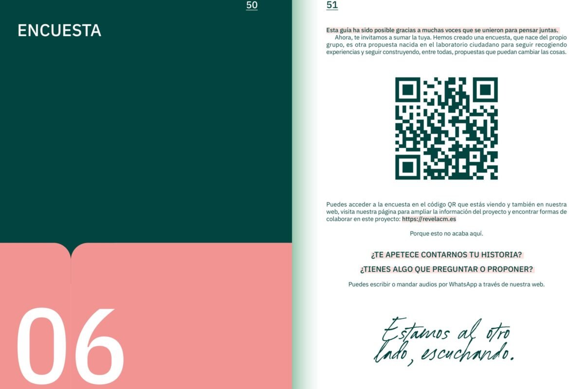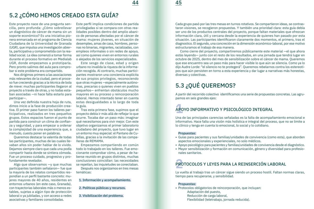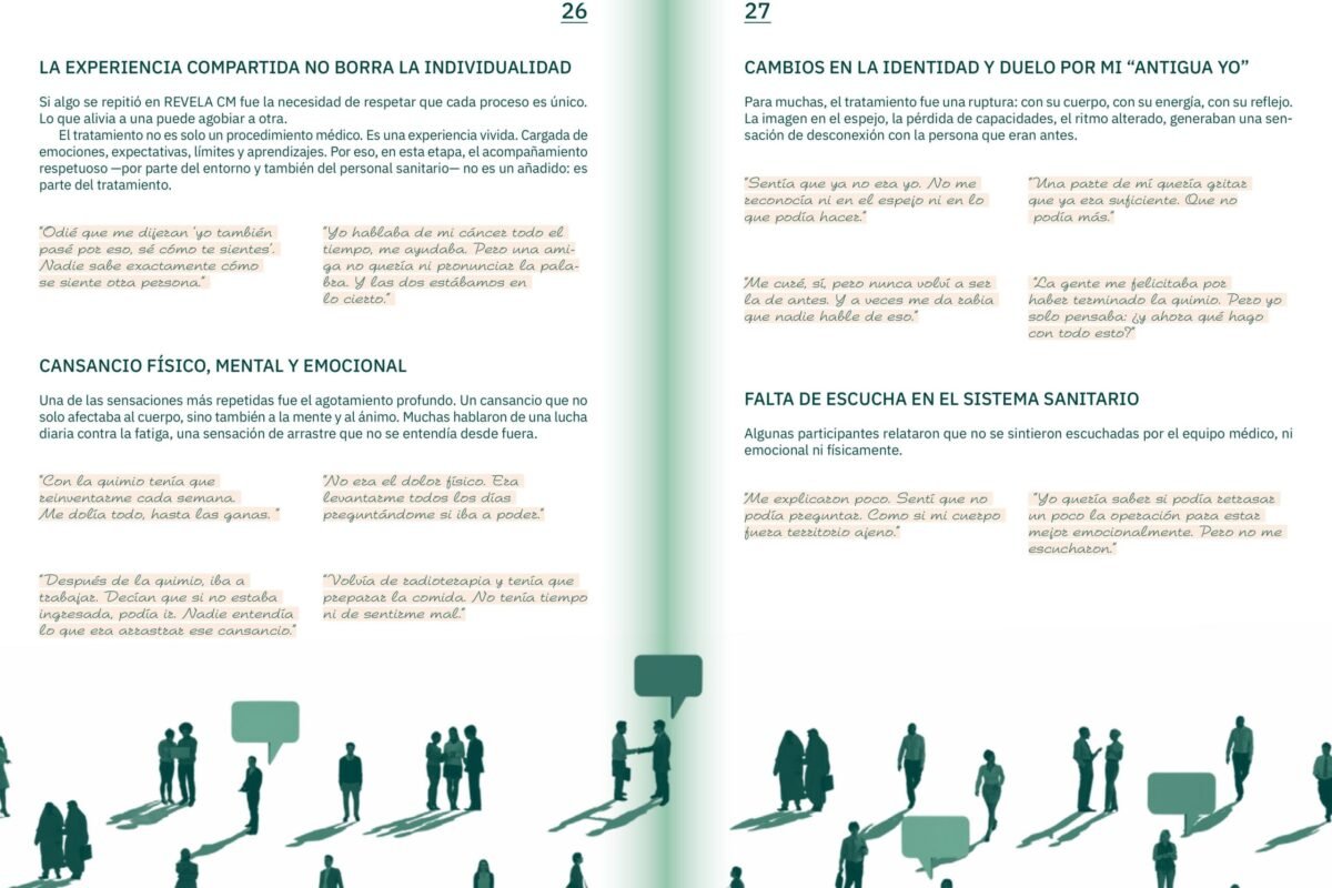 En Revela CM ya hemos creado una guía colectiva de experiencias sobre el cáncer de mama, fruto del trabajo conjunto entre personas que han enfrentado la enfermedad, familiares, profesionales de la salud y agentes sociales. Esta guía nace de la ciencia ciudadana y recoge testimonios reales que muestran cómo se vive el proceso más allá del diagnóstico: desde el impacto emocional hasta los retos económicos, familiares y laborales que acompañan la supervivencia.